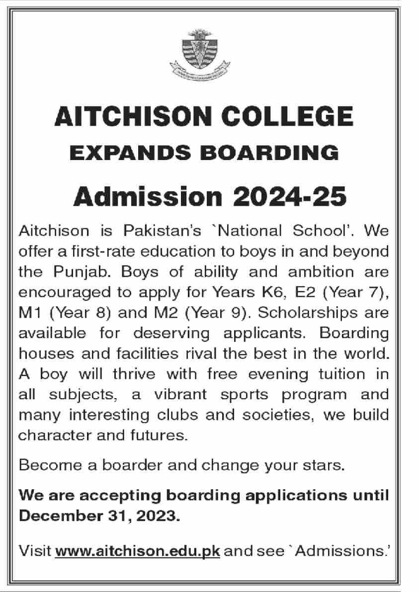 Aitchison College M1, M2, K6, E2 admissions 2023 has been started. Students who want to take admissions in Aitchison College Lahore Punjab Pakistan for academic year 2023 to continue education in Other College can apply. Students who want to enroll for academic session 2023 in Course qualification and admission criteria for Private institute can apply till last date 31 January 2024. Read newspaper ad for exact details.