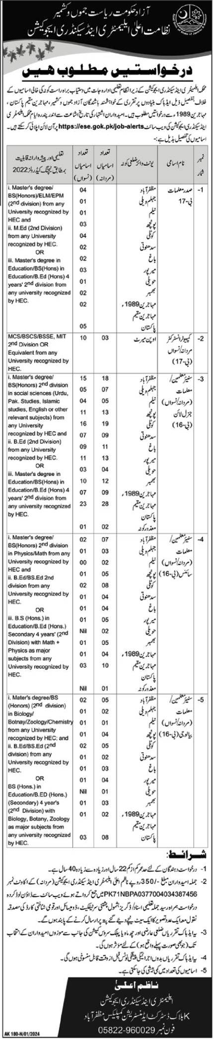 Elementary and Secondary Education Department ESED jobs advertisement dated about 18 January 2024 in daily Nawaiwaqt Newspaper invites application for the vacant post of computer instructor, instructor, principal teacher, mualim, sadar mualimaat, biology teacher, teacher, principal, science teacher and mualimeen in Muzaffarabad, bhimber, jhelum valley, mirpur, bagh, kotli, rawalakot, neelum valley, poonch, muzaffarabad and haveli AJK Pakistan. Persons with MIT, MCS, B.ed, Others and Master etc. education can apply.