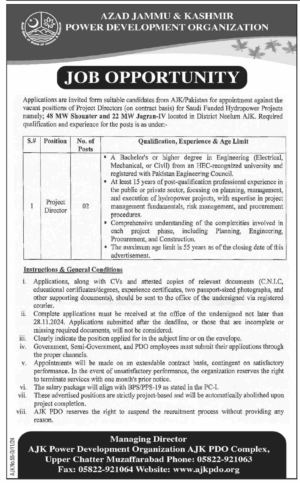 AJK Power Development Organization invites applications for job positions advertised in daily Dawn dated 9 November 2024 for following vacancies in Muzaffarabad, muzaffarabad AJK Pakistan.