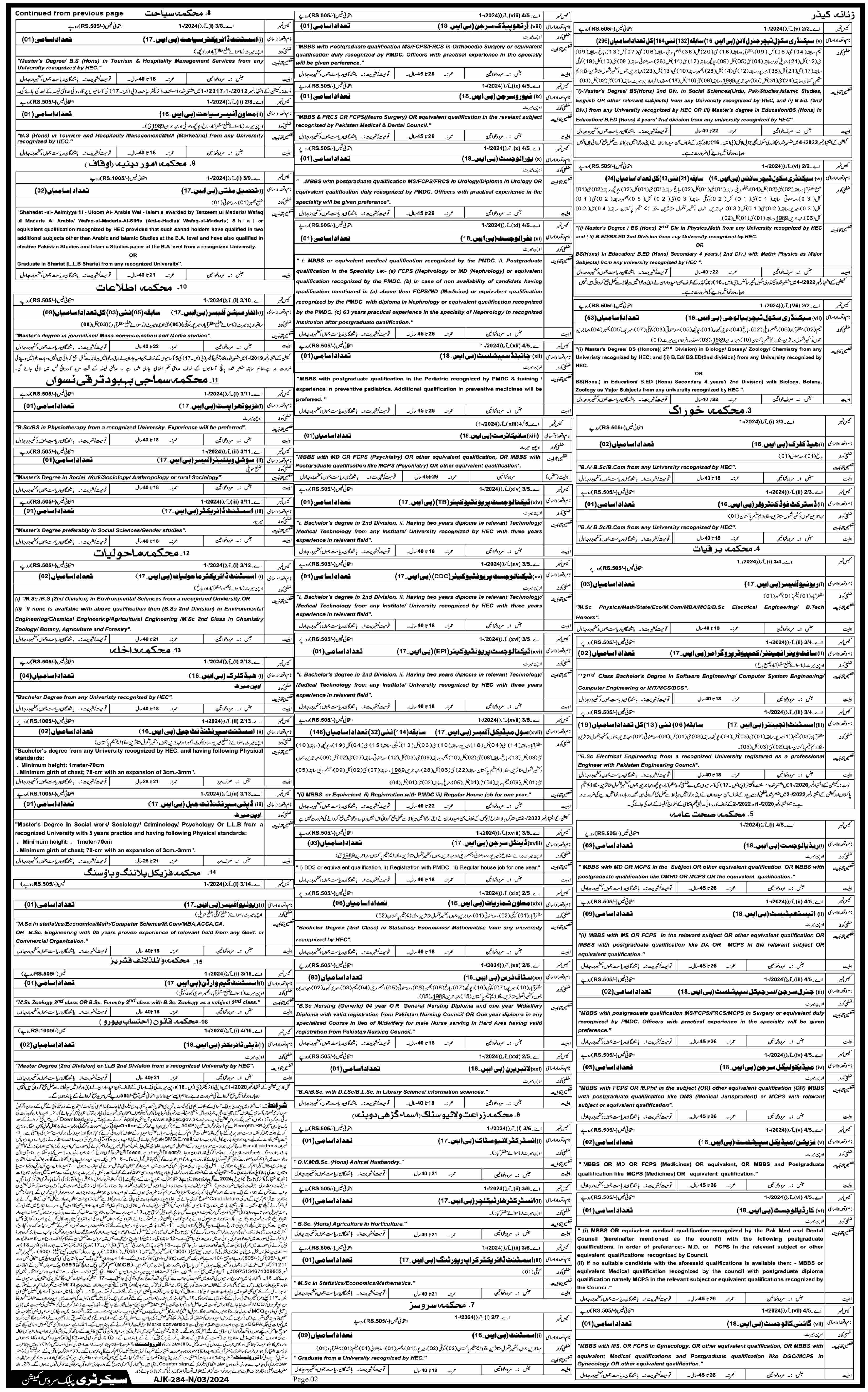 Azad Jammu & Kashmir Public Service Commission AJKPSC jobs advertisement dated about 2 March 2024 in daily Dawn Newspaper invites application for the vacant post of Secondary School Teacher Biology, Surgical Specialist, Legal Officer, Lecturer Biology, Cardiologist, Lecturer Commerce, Lecturer Chemistry, Anesthetist, Assistant Professor Maths, Lecturer Political Science, Urologist, Lecturer Arabic, Assistant Professor Chemistry, Radiologist, Computer Programmer, Assistant Professor Political Science, Secondary School Teacher Science, Lecturer Physics, Commerce Instructor, Lecturer Zoology, Lecturer Philosophy, Lecturer Urdu, Assistant Professor Statistics, Nephrologist, Assistant Professor Islamiat, Assistant Professor Biology, District Food Controller, Child Specialist, Revenue Officer, Assistant Professor Urdu, Lecturer Maths, Assistant Professor Computer Science, Assistant Professor Commerce, Assistant Professor Botany, General Surgeon, Neurosurgeon, Lecturer Psychology, Assistant Professor History, Assistant Professor, Assistant Professor Economics, Gynaecologist, Lecturer Botany, Assistant Engineer, Lecturer Economics, Secondary School Teacher General Line, Lecturer History, Medical Specialist, Assistant Professor Zoology, Physical Specialist, Orthopaedic Surgeon, Assistant Professor English, Lecturer, Assistant Professor Physics, Head Clerk, Psychiatrist, Librarian, Lecturer English, Lecturer Pakistan Studies, Lecturer Islamiat, Assistant Professor Physical Education, Medico Legal Surgeon, Lecturer Statistics and Software Engineer in Muzaffarabad, muzaffarabad AJK Pakistan. Preferred Education is Others, M.sc, BA, B.E, P.G Diploma, Bachelor, B.ed, MBA, MBBS, Phd, Master, B.com and LLb etc.