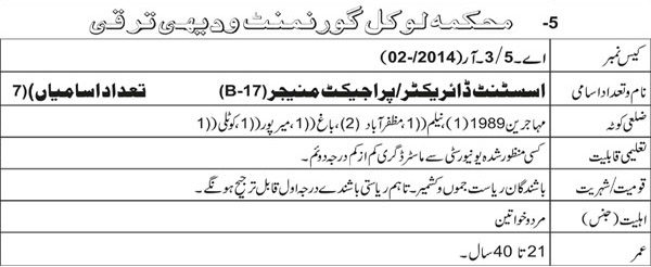 Department of Local Government & Rural Development are inviting applications for the post of “Assistant Director/Project Manger” (BS-17). Eligible candidate should have Master degree in 2nd class from recognized university.