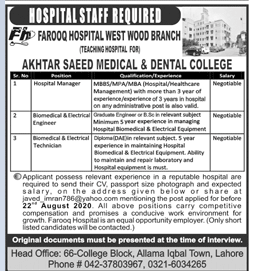 Farooq Hospital West Wood Branch Teaching Hospital For Akhtar Saeed Medical & Dental College invites applications from medical, health, mbbs, doctors and technical personnel for the posts of Hospital Manager, Biomedical Engineer, Electrical Engineer, Biomedical Technician & Electrical Technician in Lahore.