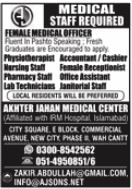 Medical, health, mbbs, doctors and experienced individuals for the posts of Medical Officer, Physiotherapist, Accountant, Cashier, Nurse, Receptionist, Pharmacist, Office Assistant, Lab Technician and Janitorial Worker required for Akhter Jahan Medical Center in Wah Cantt.