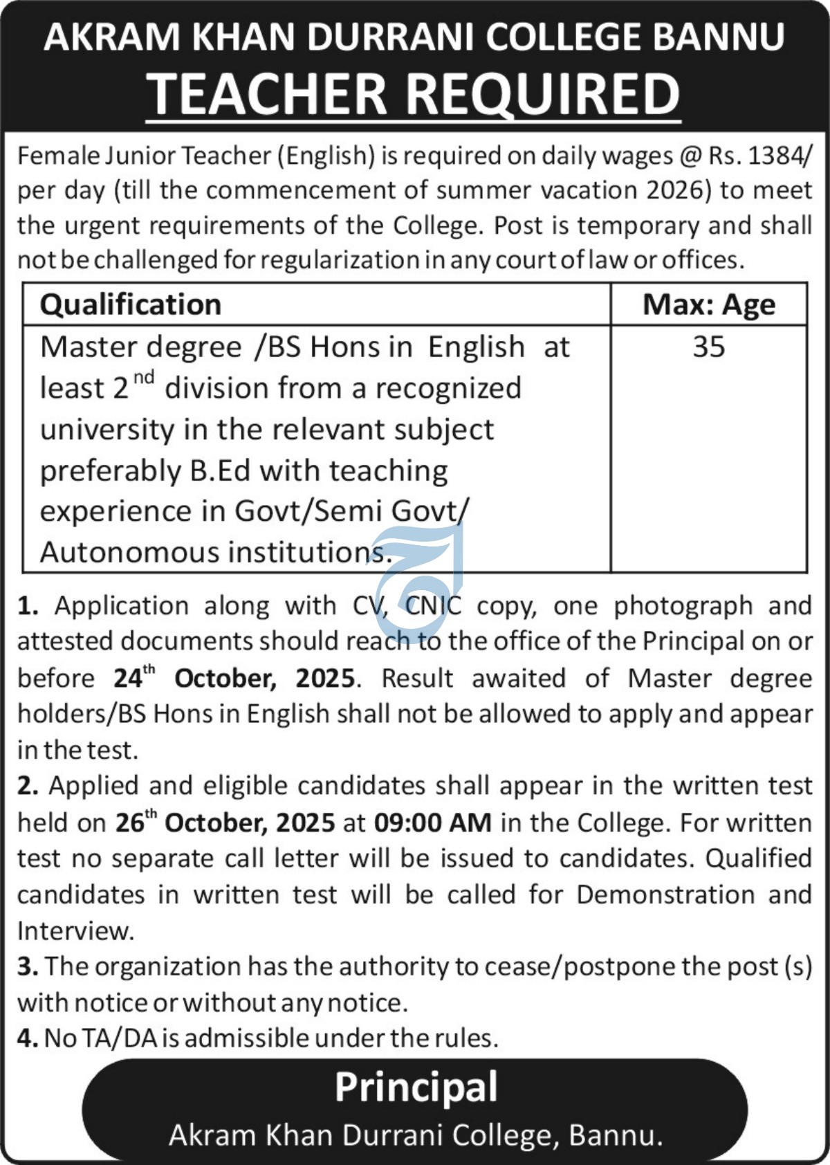 Akram Khan Durrani College Cantt Bannu, bannu Khyber Pakhtunkhwa KPK Pakistan invites applications from eligible candidates for the post of teaching staff, english teacher and female teacher as per advertisement of October 17, 2025 published in daily Aaj Newspaper. Persons with Bachelor, Master and MS etc. education can apply.