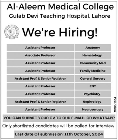 Vacancies in Al Aleem Medical College Advertisement October 2024