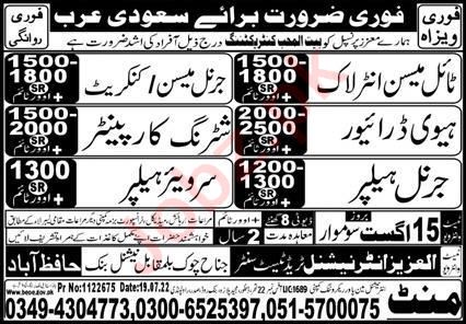 Al Aziz International jobs advertisement dated about 14 August 2022 in daily Express Newspaper invites application for the vacant post of general mason, surveyor helper, heavy driver, general helper, tile mason interlock and shuttering carpenter in Saudi Arabia, madina Saudi Arabia. Matric, Middle and Primary etc. educational qualification will be preferred.