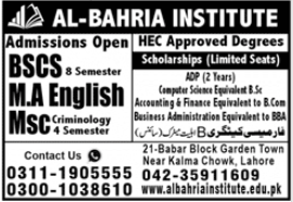Al Bahria Institute Higher Education Commission HEC Approved Degrees has announced admissions in BSCS, MA English and MSc Criminology in Lahore Punjab Pakistan. Read newspaper ad for exact details.