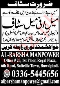 Vacant posts including male staff, office staf, female staff and computer operator are announced in AL BARSHA Manpower Recruitment Services Rawalpindi, rawalpindi Punjab Pakistan as per 18 December 2022 advertisement in daily Express Newspaper. Educational qualifications required Bachelor and Intermediate etc.