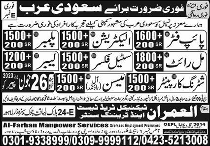 Al Farhan Manpower Services is looking for candidates for following posts as per job advertisement published in daily Express Newspaper of June 24, 2023 for location Riyadh, riyadh Saudi Arabia: