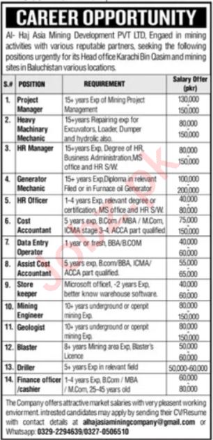 Vacant posts including Generator Mechanic, Heavy Machinery Mechanic, Finance Officer, Hr Officer, Hr Manager, Project Manager, Store Keeper, Driller, Assistant Cost Accountant, Cashier, Cost Accountant, Data Entry Operator, Geologist, Blaster and Mining Engineer are announced in Al Haj Asia Mining Development Company Quetta, quetta Balochistan Pakistan as per 24 March 2025 advertisement in daily Jang Newspaper. Educational qualifications required Others, B.com, Intermediate, Matric, BBA, Master, Bachelor, M.com, Middle and MBA etc.