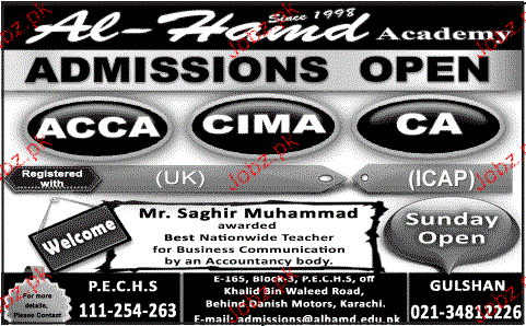 Al Hamd Academy Admission in ACCA, CIMA and CA in Karachi Read newspaper ad for exact details.