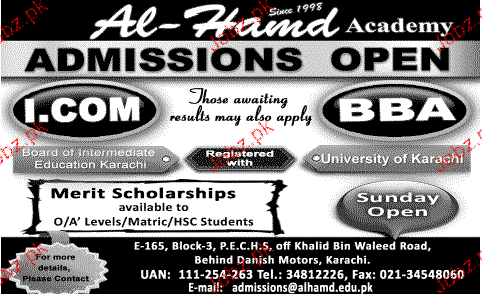 Al Hamd Academy Admission in I.Com and BBA in karachi Read newspaper ad for exact details.