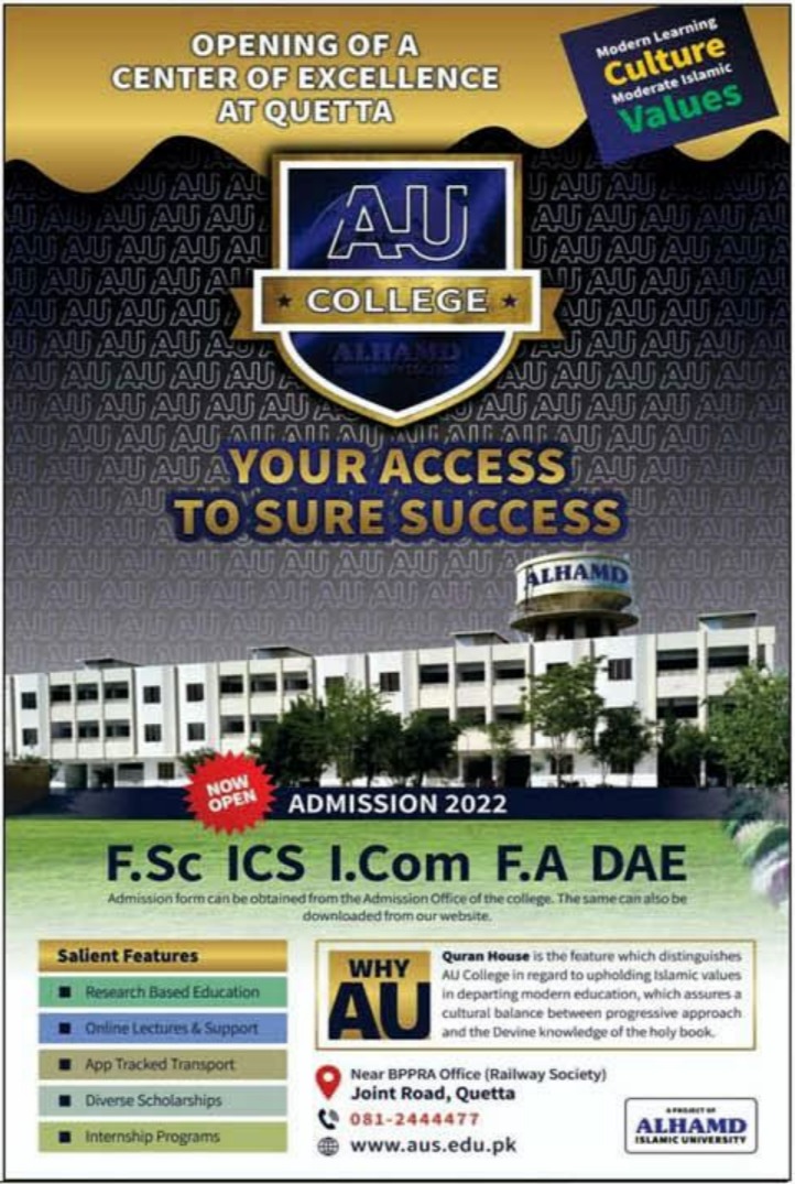 Al Hamd Islamic University AIU has announced admissions 2022 for FSc Pre Medical, Fsc Pre Engineering, ICS Computer Science, FA Arts & Humanities, DAE . Students can enroll for admissions in Al Hamd Islamic University AIU Quetta Balochistan Pakistan for academic year 2022 to continue campus based or online education in Science College. Eligible candidates for admissions in DAE, I.com, Intermediate and ICS can apply as per Private institute criteria and before closing date 14 September 2022 after reading advertisement online. Read newspaper ad for exact details.
