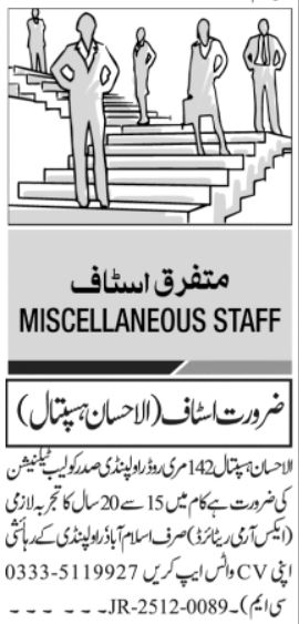 Al Ihsan Hospital latest Classifieds Medical jobs and others can be applied till 20 December 2025 or as per closing date in newspaper ad. Read complete ad online to know how to apply on latest Al Ihsan Hospital job opportunities.