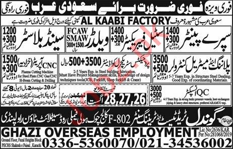 A well known and reputed Al Kaabi Factory is looking for experienced and technical persons for the positions of Spary Painter, Steel Fabricator, Welder, Planning Controller, Material Controller, Structural Coordinator, CNC Operator & Quality Control QC Inspector in Saudi Arabia.