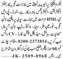 Al Karam Packages jobs advertisement dated about 1 October 2025 in daily Jang Newspaper invites application for the vacant post of electrician, tape line operator, foreman fitter and electronics technician in Hub, hub Balochistan Pakistan. Educational qualifications required Matric, Intermediate and DAE etc.