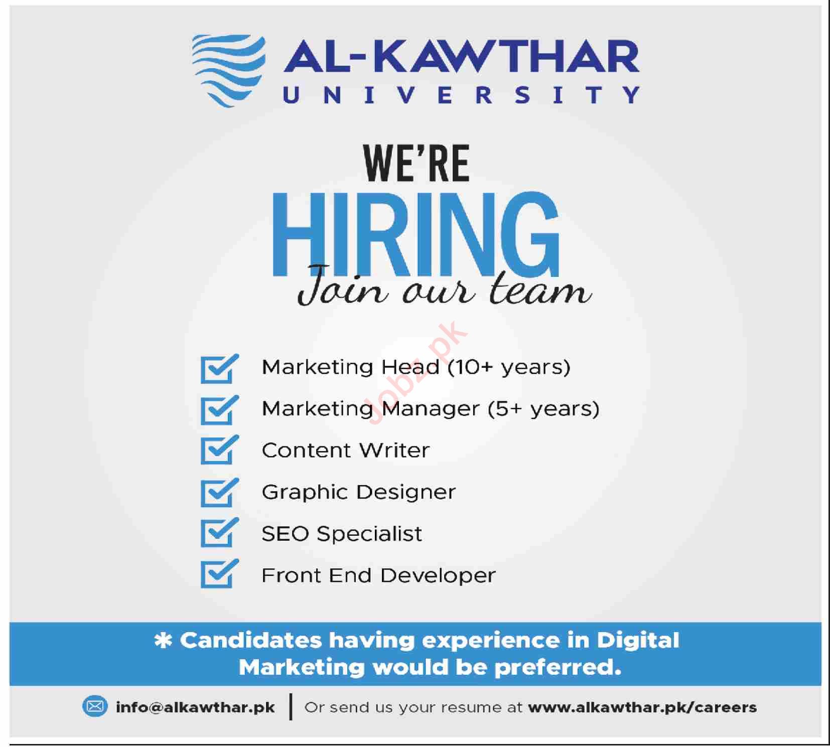 Al Kawthar University Karachi, karachi Sindh Pakistan invites applications from eligible candidates for the post of seo specialist, front end developer, marketing head, marketing manager, content writer and graphic designer as per advertisement of November 12, 2023 published in daily Dawn Newspaper. Educational qualifications required MS, Bachelor, M.sc, MA and Master etc.
