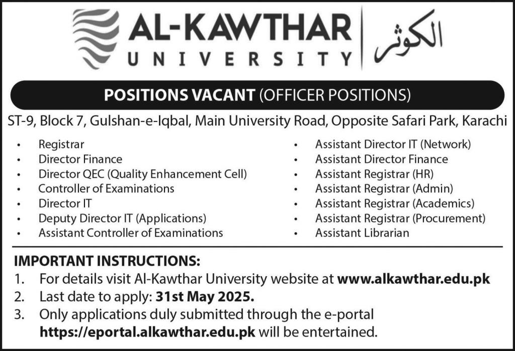 Al Kawthar University is looking for candidates for following posts as per job advertisement published in daily Express Newspaper of May 6, 2025 for location Gulshan-e-Iqbal - Block 7 Karachi, karachi Sindh Pakistan: