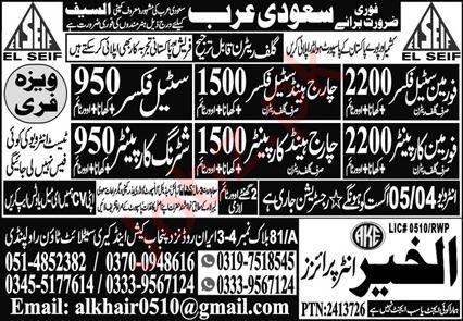 Vacant posts including Foreman Carpenter, Shuttering Carpenter, Charge Hand Steel Fixer, Charge Hand Carpenter, Foreman Steel Fixer and Steel Fixer are announced in Al Khair Enterprises Riyadh, riyadh Saudi Arabia as per 29 July 2024 advertisement in daily Express Newspaper. Candidates with Middle, Primary, Matric and Intermediate etc. educational background will be preferred.