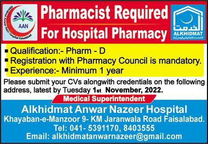 Al Khidmat Anwar Nazir Hospital jobs advertisement dated about 26 October 2022 in daily Express Newspaper invites application for the vacant post of pharmacist in Faisalabad, faisalabad Punjab Pakistan. Pharma D, Intermediate and Bachelor etc. educational qualification will be preferred.