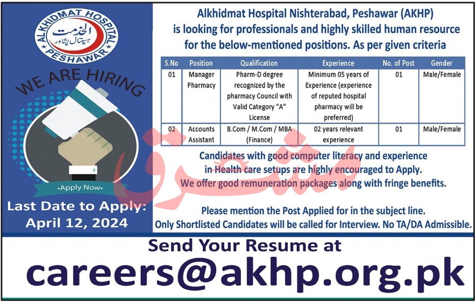Vacancies in Al Khidmat Hospital Advertisement April 2024