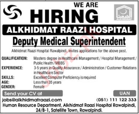 Al Khidmat Raazi Hospital Deputy Medical Superintender Jobs