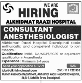 Vacant posts including consultant anesthesiologist are announced in Al Khidmat Raazi Hospital Rawalpindi, rawalpindi Punjab Pakistan as per 10 November 2024 advertisement in daily Jang Newspaper. MBBS etc. educational qualification will be preferred.