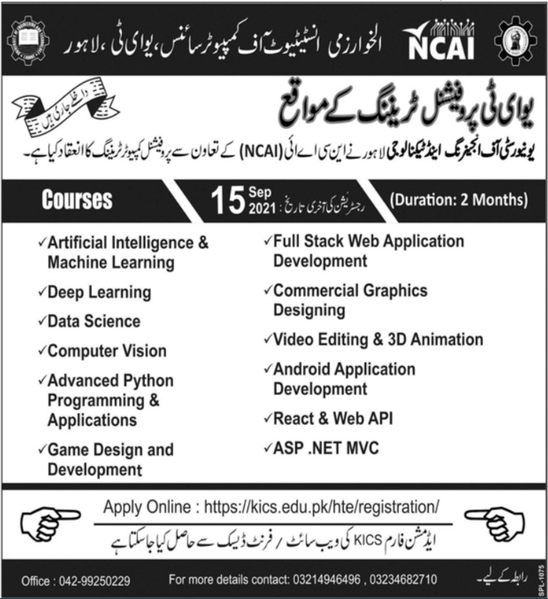 Al Khwarizmi Institute of Computer Science has announced admissions for courses in Artificial Intelligence & Machine Learning, Deep Learning, Data Science, Computer Vision, Advanced Python Programming & Applications, Dame Design and Development, Full Stack Web Application Development, Commercial Graphics Designing, Video Editing & 3D Animation, Android Application Development, React & Web API and ASP Dot Net MVC. Read newspaper ad for exact details.