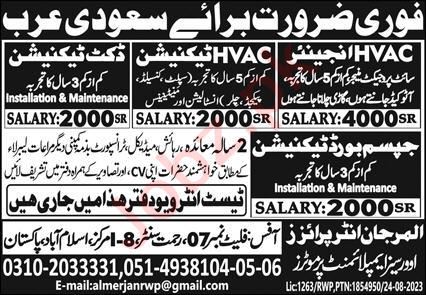 Vacant posts including hvac engineer, gypsum board technician, docket technician and hvac technician are announced in Al Marjan Enterprises Riyadh, riyadh Saudi Arabia as per 27 August 2023 advertisement in daily Express Newspaper. Educational qualifications required Primary, Matric and Middle etc.