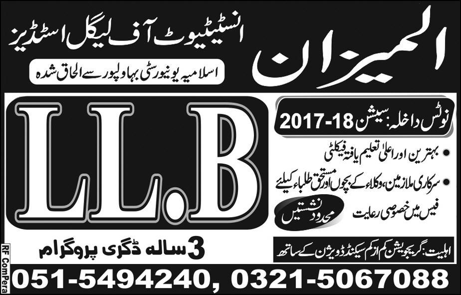 Al Meezan Institute Legal Studies Affiliated With the University of Bahawalpur Admission in LLB in Rawalpindi. Admission Session 2017-2018. Three year Degree Program. Read newspaper ad for exact details.