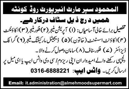 Al Mehmood Super Mart Quetta, quetta Balochistan Pakistan invites applications from eligible candidates for the post of operation manager, account assistant, floor manager, digital marketing manager, graphic designer, floor staff and accountant as per advertisement of June 24, 2024 published in daily Express Newspaper. Persons with Intermediate, B.com, Matric, Bachelor, BA and I.com etc. education can apply.