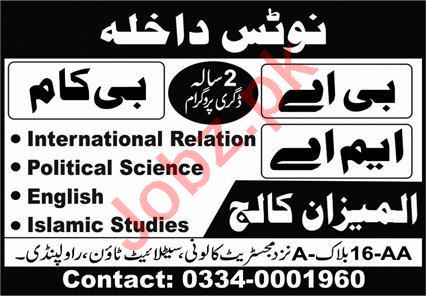 Al Mizan College Rawalpindi, Pakistan is starting admissions fall 2020 for the classes of BA, B Com, MA Political Science, English, Islamic Studies and International Relations. Read newspaper ad for exact details.
