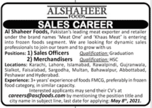 Experienced and field professional candidates for the posts of Sales Officers and Merchandisers required for Al Shaheer Foods in Karachi, Lahore, Islamabad, Rawalpindi, Gujranwala, Sialkot, Faisalabad, Sargodha, Multan, Bahawalpur, Abbottabad, Peshawar & Hyderabad.