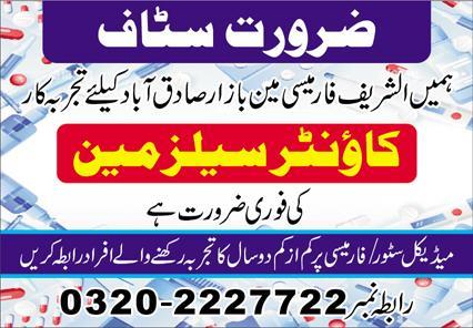 Al Shareef Pharmacy Sadiqabad Punjab Pakistan invites applications from eligible candidates for the post of salesman as per advertisement of February 6, 2022 published in daily Express Newspaper. Candidates with Bachelor and Intermediate etc. educational background will be preferred.