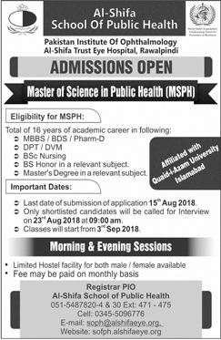 Al Shifa School of Public Health Admission in Master of Science in Public Health MSPH in Rawalpindi. Candidate who seeking for admission must be MBBS / BDs. Read newspaper ad for exact details.