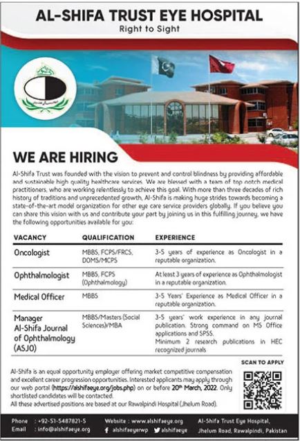 Latest Medical jobs and others Private jobs in Al Shifa Trust Eye Hospital closing date is around March 20, 2022, see exact from ad. Read complete ad online to know how to apply on latest Al Shifa Trust Eye Hospital job opportunities.