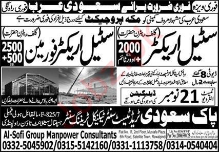 Al Sofi Group Manpower Consultants Riyadh, riyadh Saudi Arabia invites applications from eligible candidates for the post of steel erector foreman and steel erector as per advertisement of November 20, 2023 published in daily Express Newspaper. Preferred Education is Primary, Matric and Middle etc.