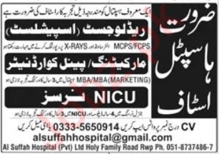 Al Suffah Hospital Rawalpindi, rawalpindi Punjab Pakistan invites applications from eligible candidates for the post of radiologist, marketing coordinator and nicu nurse as per advertisement of December 11, 2022 published in daily Jang Newspaper. Persons with Matric, MBBS, BBA, MBA and Master etc. education can apply.