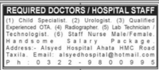 Al Syed Hospital invites applications for job positions advertised in daily Jang dated 7 August 2022 for following vacancies in Taxila, taxila Punjab Pakistan.