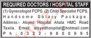 Al Syed Hospital invites applications for job positions advertised in daily Jang dated 31 July 2022 for following vacancies in Taxila, taxila Punjab Pakistan.