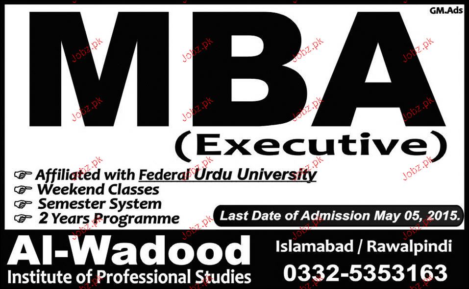 Al Wadood Institute of Professional Studies Admission in MBA in Islamabad. Read newspaper ad for exact details.