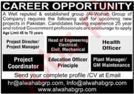 Vacant posts including Head Of Engineering Electrical, Plant Manager, Health Officer, Project Coordinator, Education Office Principal, Project Director and Project Manager are announced in Al Wahab Group Karachi, karachi Sindh Pakistan as per 17 November 2024 advertisement in daily The News Newspaper. Persons with Bachelor, MS and Master etc. education can apply.