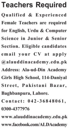 Vacant posts including urdu teacher, teacher, female teacher, computer science teacher and english teacher are announced in Ala Ud Din Academy Lahore, lahore Punjab Pakistan as per 18 May 2024 advertisement in daily Jang Newspaper. BA, BCS, Bachelor, Master and MA etc. educational qualification will be preferred.