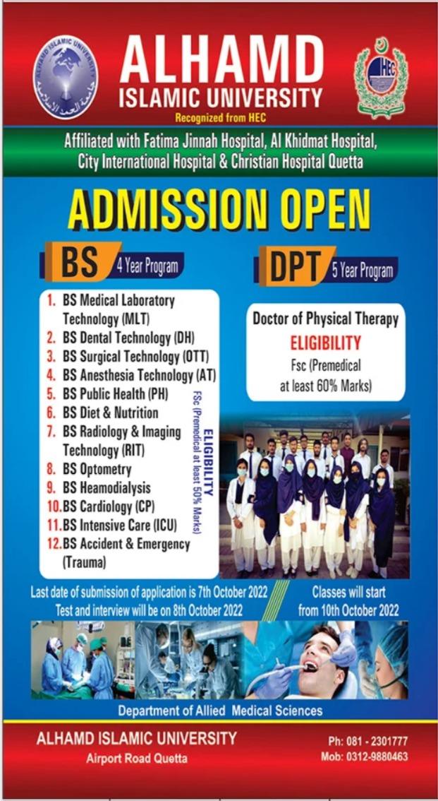 Alhamd Islamic University has announced admissions 2022 for Bachelor of Science in Medical Laboratory Technology MLT, Dental Technology DH, Surgical Technology OTT, Anaesthesia Technology AT, Public Health PH, Diet and Nutrition, Radiology and Imaging Technology RIT, Optometry, Heamodialysis, Cardiology CP, Intensive Care Unit ICU, Accident and Emergency Trauma. Doctor of Physical Therapy DPT.. Eligible students can apply for academic admissions 2022 in Alhamd Islamic University Quetta Balochistan Pakistan for Medical University. Eligible candidates for admissions in Bachelor, DPT and BS can apply as per Private institute criteria and before closing date 7 October 2022 after reading advertisement online. Read newspaper ad for exact details.