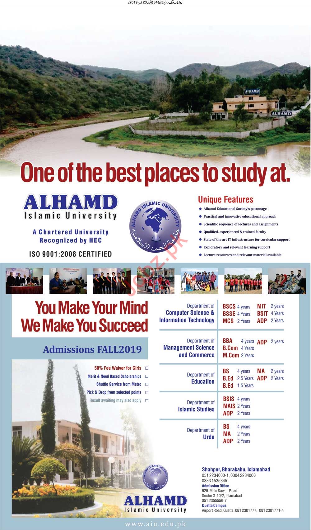 Alhamd Islamic University A Chartered University Recognized by HEC Higher Education Commission offers admissions for BSCS, BSSE, MCS, MIT, BSIT, ADP, BBA, B-Com, M-Com, BS, B.Ed, MA, BSIS, MAIS in Islamabad. Read newspaper ad for exact details.