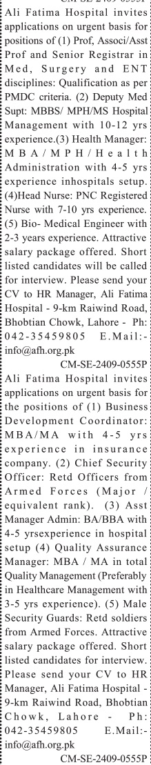 Ali Fatima Hospital AFH invites applications for job positions advertised in daily Jang dated 25 September 2024 for following vacancies in Lahore, lahore Punjab Pakistan.
