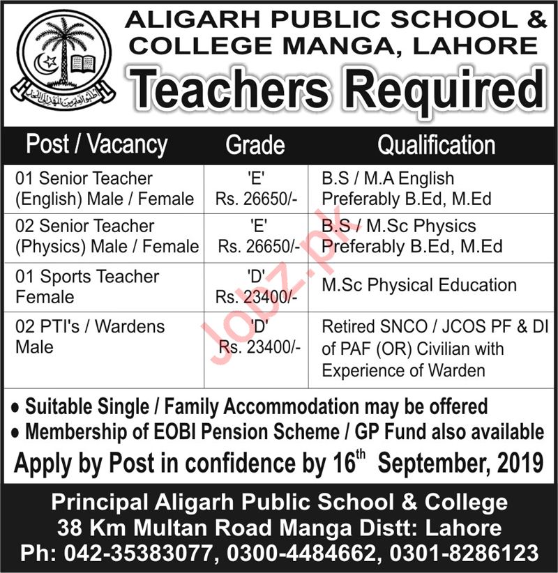 Vacancies in Aligarh Public School & College Advertisement September 2019