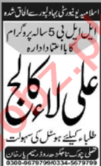 Ali Law College Rahim Yar Khan, Pakistan is announcing admissions summer 2020 for academic session 2020 to 2024 the classes of LLB or Bachelor in Law for Five Years Program. Read newspaper ad for exact details.