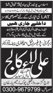 Ali Law College admissions 2022 for 5 Years LLB Program has been announced. Eligible students who qualify as per admission criteria in Ali Law College Multan Punjab Pakistan can apply in Law College for academic year 2022. Eligible students for fulfilling criteria for admissions in LLb can enroll as per Private admission policy 2022 till closing date 30 June 2022. Read newspaper ad for exact details.