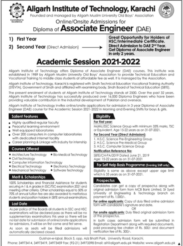 Aligarh Institute of Technology Karachi is offering admissions for session 2021-22 Diploma of Associate Engineer DAE courses. The students recently passed out from Matric can apply. Read newspaper ad for exact details.